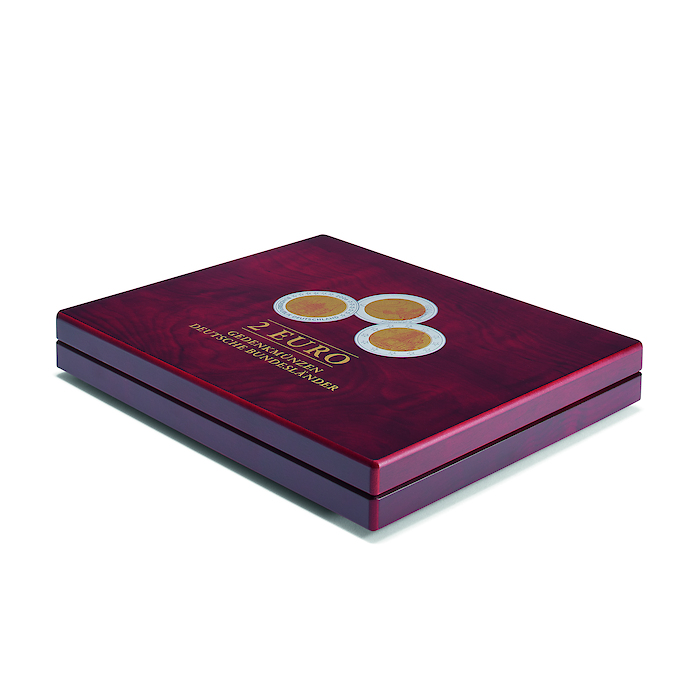 mahagonifarbener Holzmaserung für 16 2-Euro-Gedenkmünzen der 1. oder 2. Serie "Deutsche Bundesländer" in Kapseln. Einlage mit veloursartiger Oberfläche. Die Kassette bietet Platz für ein Motiv je Bundesland und ist für Kapseln bis zu einem Außendurchmesser von 32 mm geeignet (z.B. LEUCHTTURM ULTRA Perfect-Fit 2 €). Edler Deckeldruck, sowie unauffälliger Magnetverschluss. Kapseln nicht im Lieferumfang enthalten. Außenformat: 250 x 30 x 200 mm.