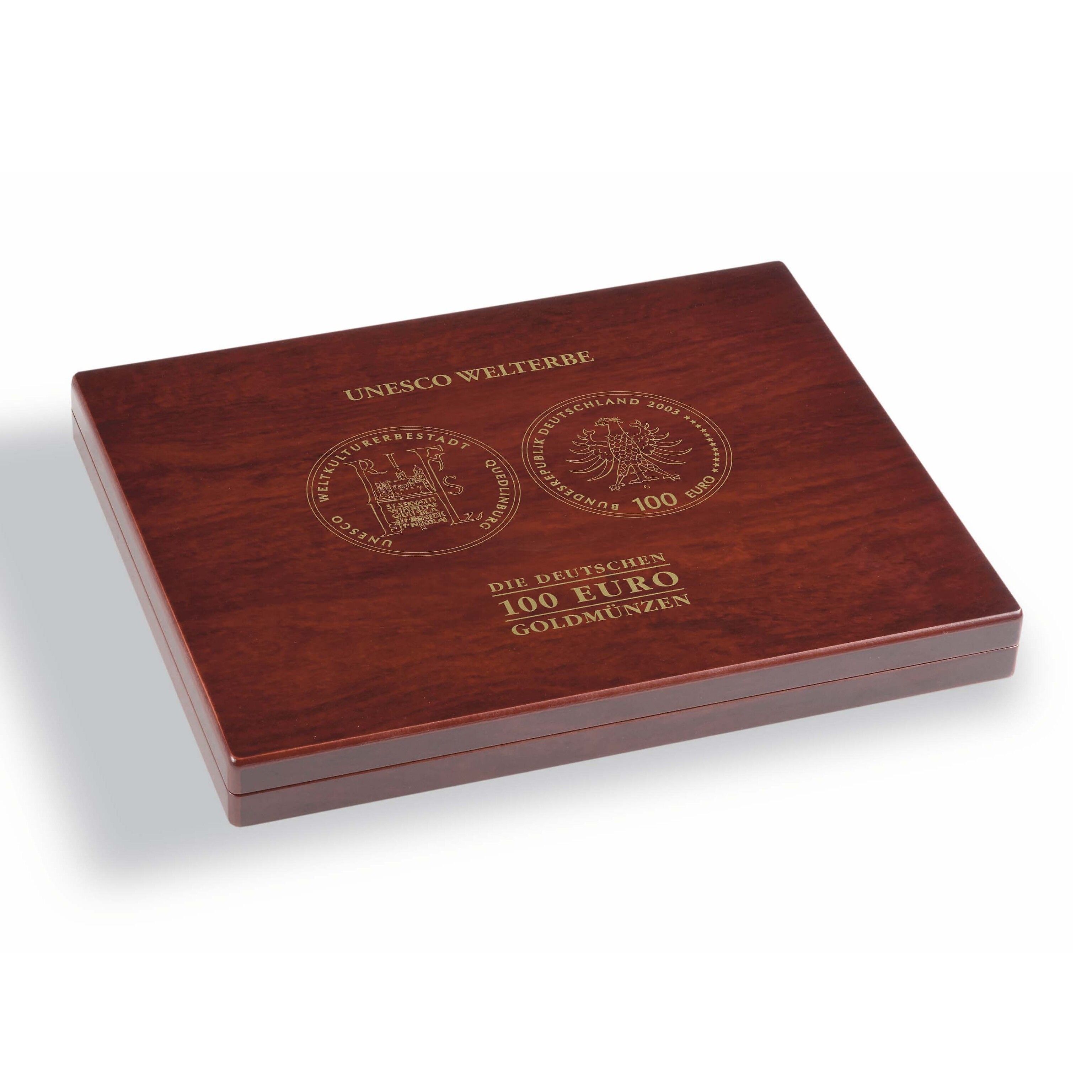 Münzkassette in edler, mahagonifarbener Holzmaserung zur Unterbringung von 16 deutschen 100-Euro-Goldmünzen der Serie „UNESCO Welterbe“ in Originalkapseln. 1 Einlage mit roter, veloursartiger Oberfläche und 16 runden Feldern (Ø 33,5 mm). Goldfarbener Deckel- und Kissendruck mit Münzmotiv. Deckelkissen mit rotem Satin gepolstert. Sicherer und unauffälliger Magnetverschluss.