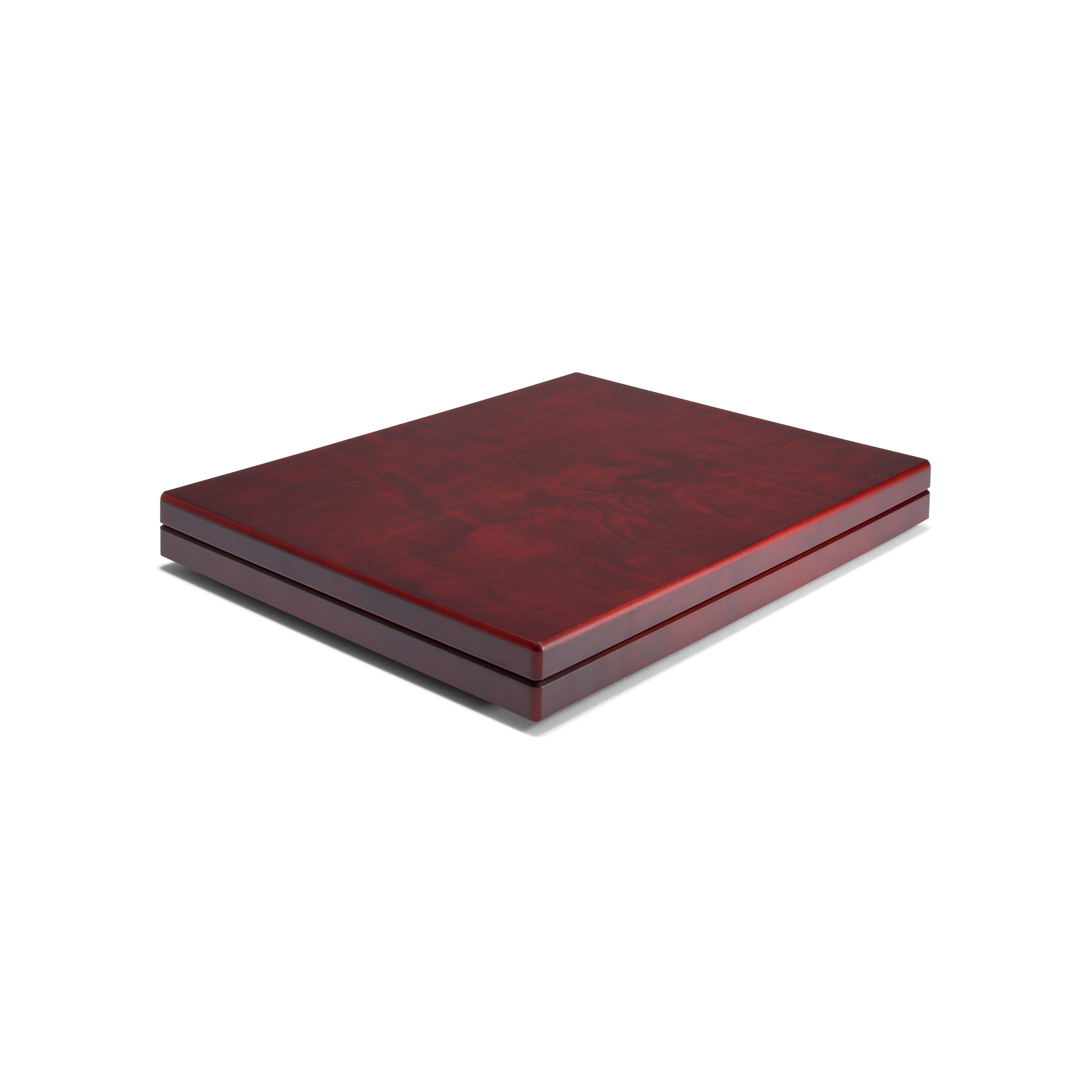 Hochwertige Münzkassette für 20 QUADRUM-Münzkapseln oder 20 Münzrähmchen. Oberfläche in mahagonifarbener Holzmaserung. 1 Einlage mit 20 eckigen Einteilungen (50 x 50 mm). Einlage mit schwarzer, veloursartiger Oberfläche, Deckelkissen mit schwarzem Satin gepolstert. Besondere Stabilität durch zwei vergoldete Scharniere. Außenformat: 305 x 245 x 30 mm