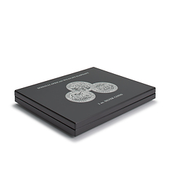 Hochwertige, schwarze Münzkassette zur Unterbringung von 20 Somalia African Wildlife Elephant Silbermünzen (1 Oz.) in LEUCHTTURM Kapseln (GRIPS 39). 1 Einlage mit schwarzer, veloursartiger Oberfläche und 20 runden Feldern (Ø 45 mm). Edler, silberfarbener Deckel- und Kissendruck mit Münzmotiven. Deckelkissen mit schwarzem Satin gepolstert. Sicherer und unauffälliger Magnetverschluss. Außenformat: 305 x 30 x 245 mm.